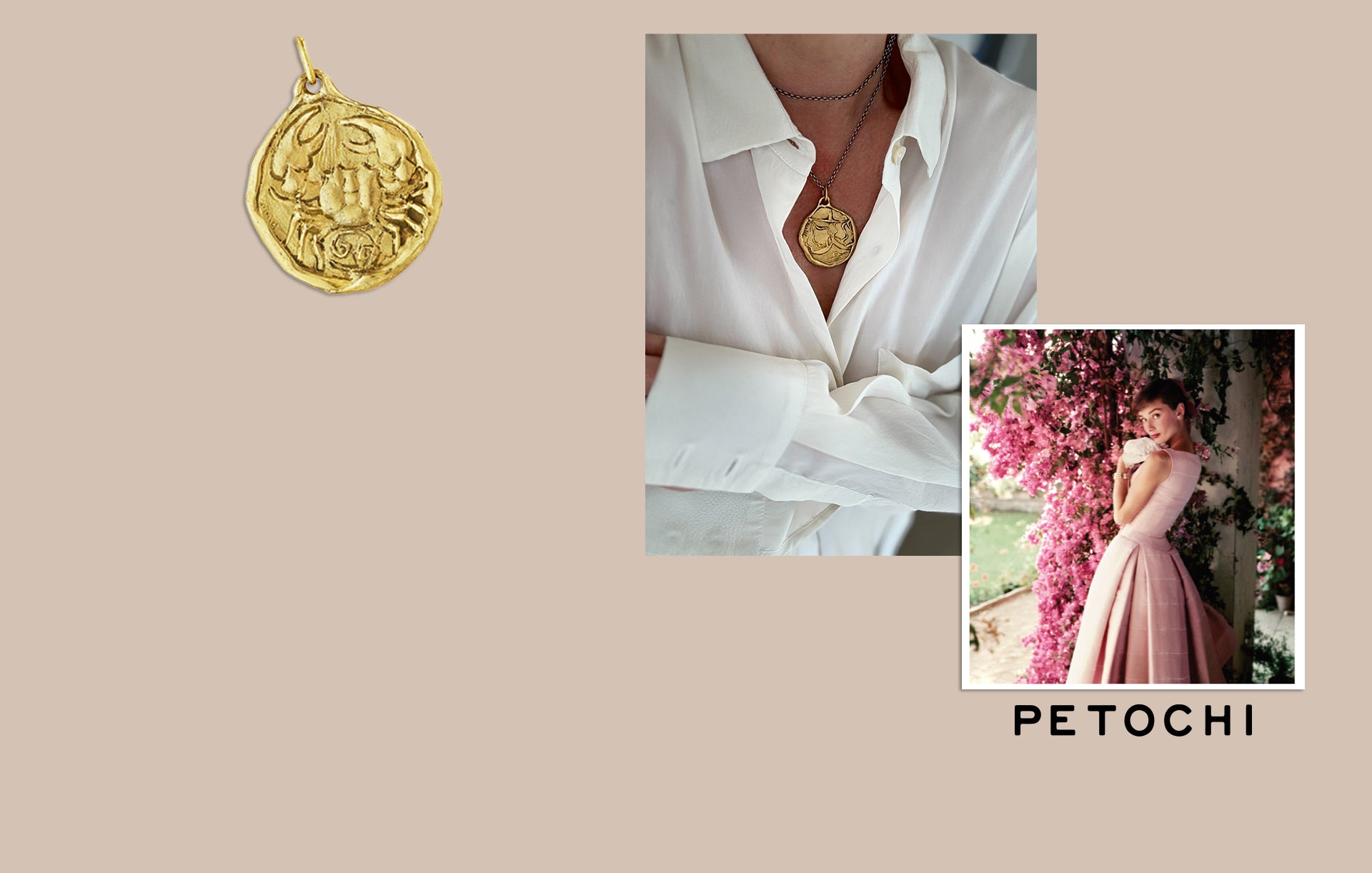 Millie & Noah is partnering with sixth-generation Roman jeweler Petochi to reissue a collection of zodiac pendants from their 1970 archives. Petochi has realized one-of-a-kind jewelry for over a century for a distinguished clientele including European royal families, movie stars and the Vatican. Audrey Hepburn became a loyal customer to the brand after filming la Dolce Vita.